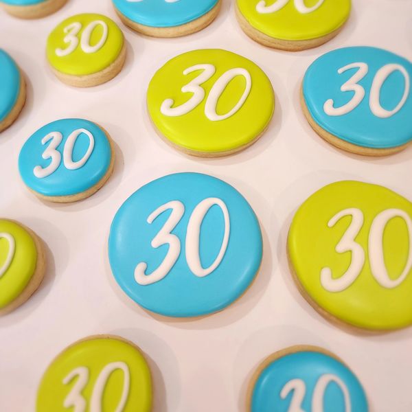 Mini 2 inch sugar cookies with a single icing color coordinating with custom order colors. Available in circles or squares.
